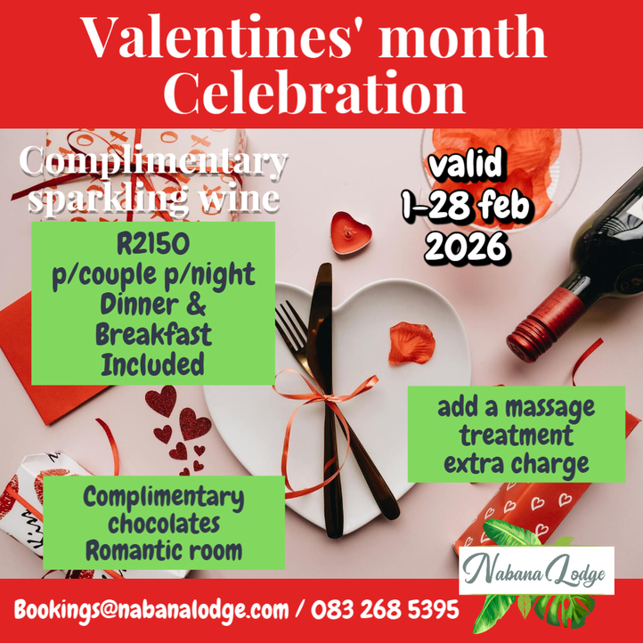 At Nabana Lodge we will create the romantic setting which includes sparkling wine and chocolates.